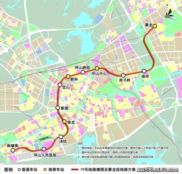 该线路总共规划12座车站,包括南塘围,坪山人民医院,汤坑,锦龙,新围,宝山,新和,坪山剧院,坪山中心,燕子岭,南布,聚龙站,时速80公里。
