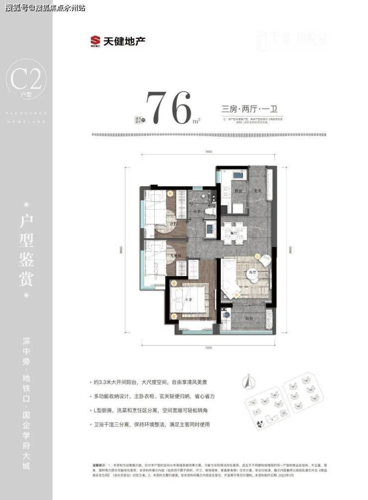 76㎡的3房2厅1卫:设计的是竖厅格局,进门入户玄关,客厅3.3米开间,L型厨房,卫生间三段式分离,得房率75.05%(不含赠送),阳台朝西北、西南或东北向。 天健和悦府_售楼处_Vip Tel:400-013-9098中介勿扰