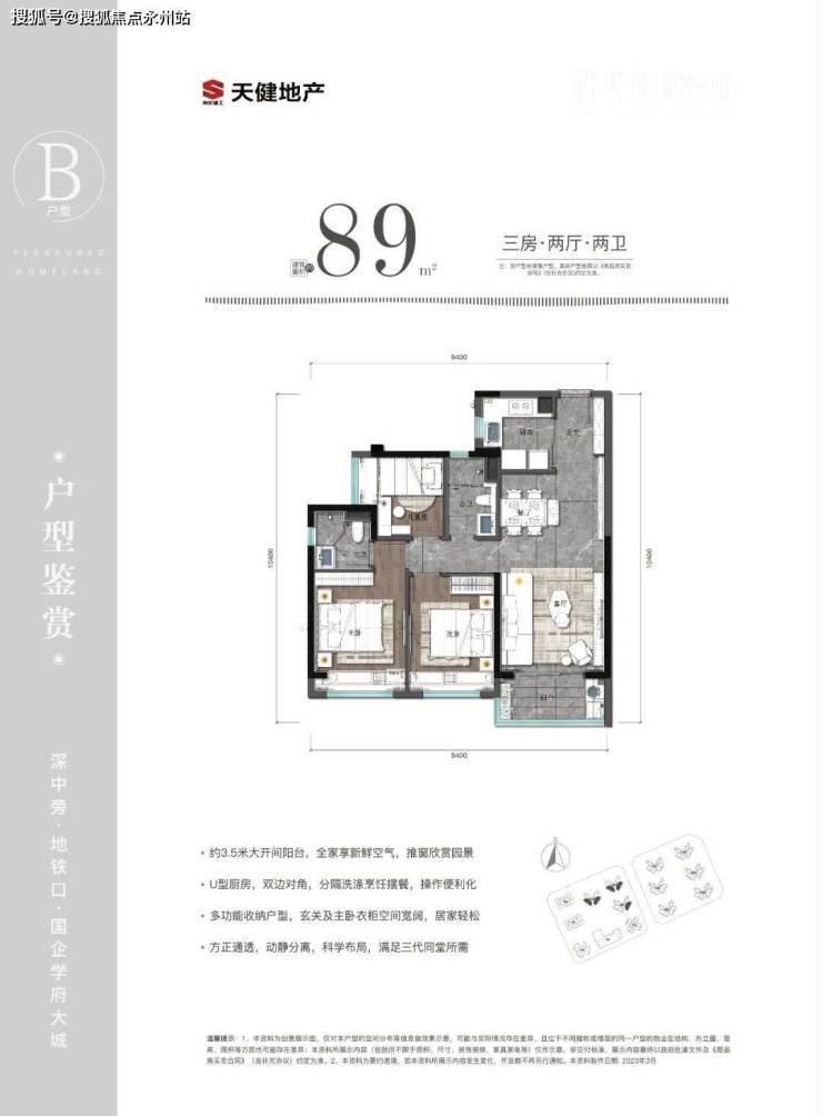 99㎡的3房2厅2卫:设计的是经典竖厅格局,可以改4房,进门入户玄关,客厅5.3米开间,三开间朝南,U型厨房,公卫三段式分离,得房率81.7%(不含赠送),阳台朝西南向。 天健和悦府_售楼处_Vip Tel:400-013-9098中介勿扰