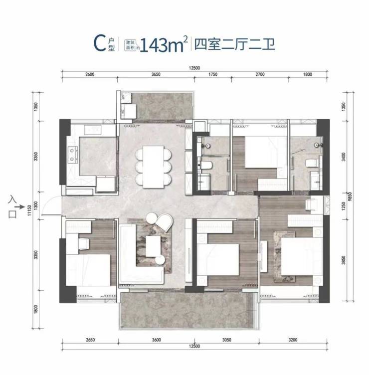 C户型 建筑面积约143㎡ 4房2厅2卫 东南 西北通大四房