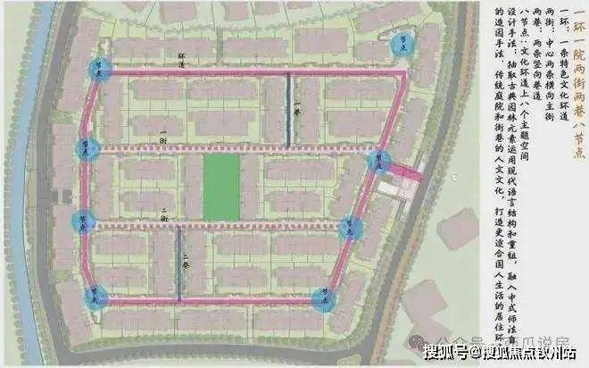 岭南院子的园林采用的是岭南新中式风格,整体设计采用一环、一院、两街、两巷、八节点的的设计。