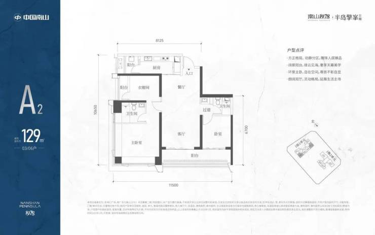A2有两条腿,分别1-1栋03/06,主朝向是东南向,双龙抱珠格局。这个户型是超阔大阳台,朝向优于A1,但公卫是个暗卫。