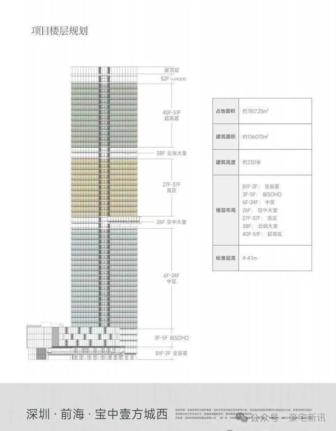 华侨城宝辰总高230米,为宝中最高楼;项目52层,分为中区、高区、超高区,6层起卖,11、39F为避难层,25-26F为空中会所,28F为空中大堂。除了空中大堂项目还有地下入库大堂+首层大堂,一共三重大堂。