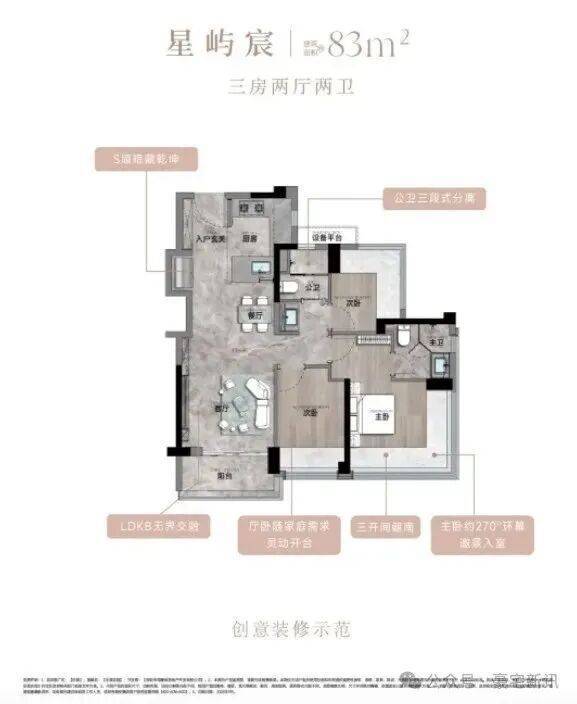 83㎡的3房2厅2卫,设计的是经典竖厅格局,客厅3.35米开间,LDKB一体化,S墙设计预留双开门冰箱卡槽位,三开间朝南,动静分区,分别做到了主卧16.02㎡/次卧9.08㎡/次卧7.01㎡(包含墙体飘窗),U型厨房,公卫三段式干湿分离,赠送1.98平设备平台,得房率约77.15%(不含赠送),阳台5.02m²西南或东南朝向。靓点:83平做到了3房2卫,主卧270°无柱转角飘窗,厨房烟道外置+额外赠送设备平台,并且是纯南向格局。