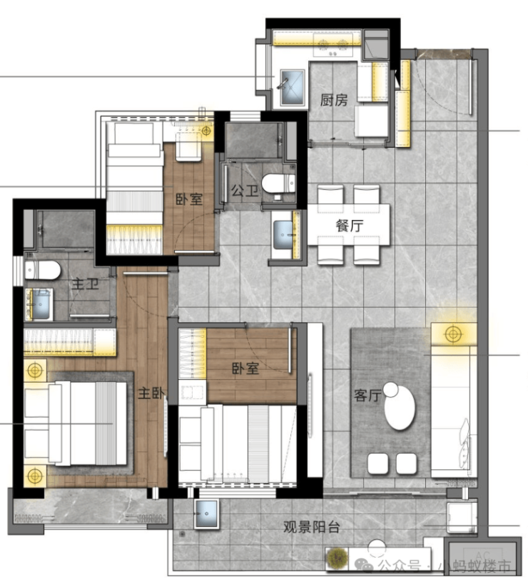 89㎡三房两卫:独立玄关、U型厨房、双卫设计,小户型也能兼顾舒适与功能;