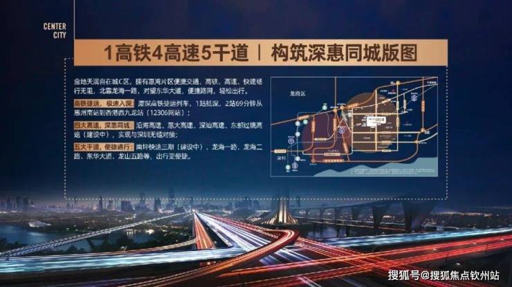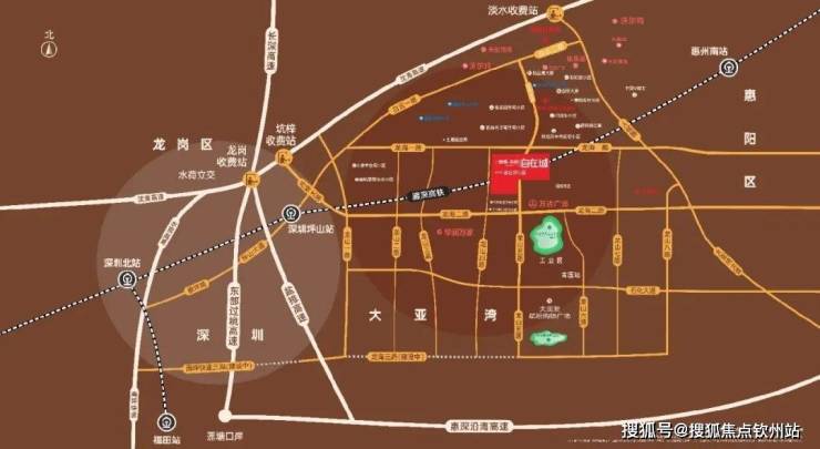 【交通】高铁捷运,极速入深:厦深高铁捷运列车,1站抵深,2站约69分钟从惠州南站到香港西九龙站(12306网站);四大高速,深惠同城:沿海高速、惠大高速、深汕高速、东部过境高速(建设中),实现与深圳无缝对接;五大干道,便捷通行:南坪快速三期(建设中)、龙海一路、龙海二路、东华大道、龙山五路等,出行更便捷。距离深圳坪山新区约3公里,约5分钟车程实现两城切换。
