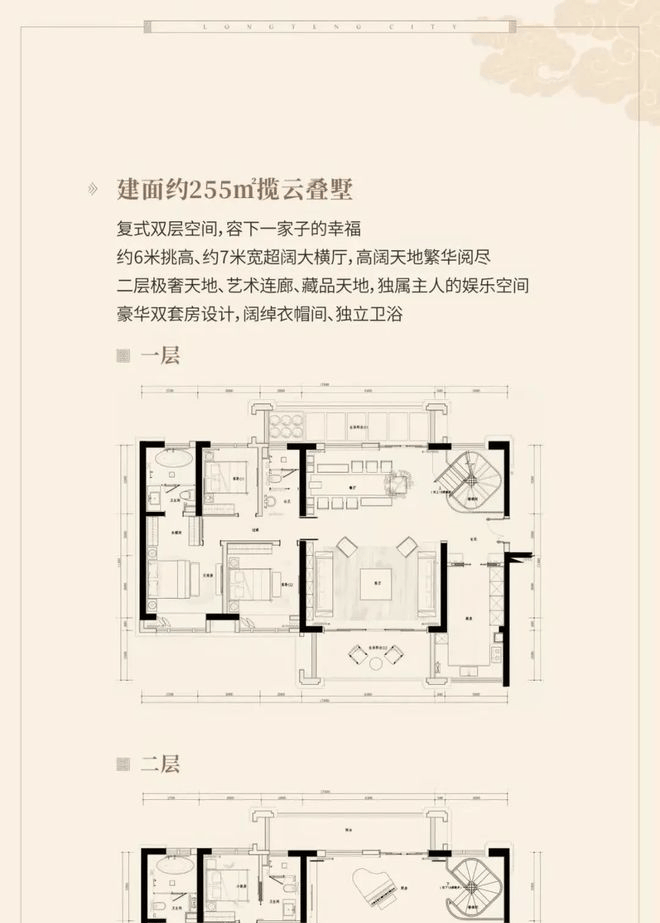 建面约440-837㎡国风院墅(总价约800万-2500万/套),建面约239-255㎡揽云叠墅(总价约500万-600万/套)