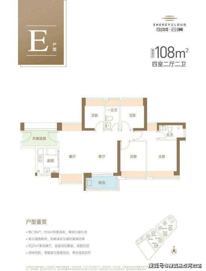 建面约108㎡南北通透4房2厅2卫,阔绰大横厅,演绎多样家庭生活场景,东南向户型,3面采光,生活洒满阳光。