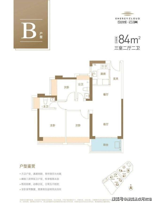 建面约84㎡硬核3房2厅2卫,餐客厅一体,更显开阔大气,动静分区,同等面积多一卫。