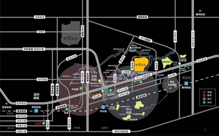 高速:周边汇聚了深汕高速、长深高速、沿海高速、外环高速(规划中)4条高速 ,以及丹平快速、清平快速、南坪快速3条快速路 ,自驾出行便捷 ,能够快速连接深圳及周边城市 。