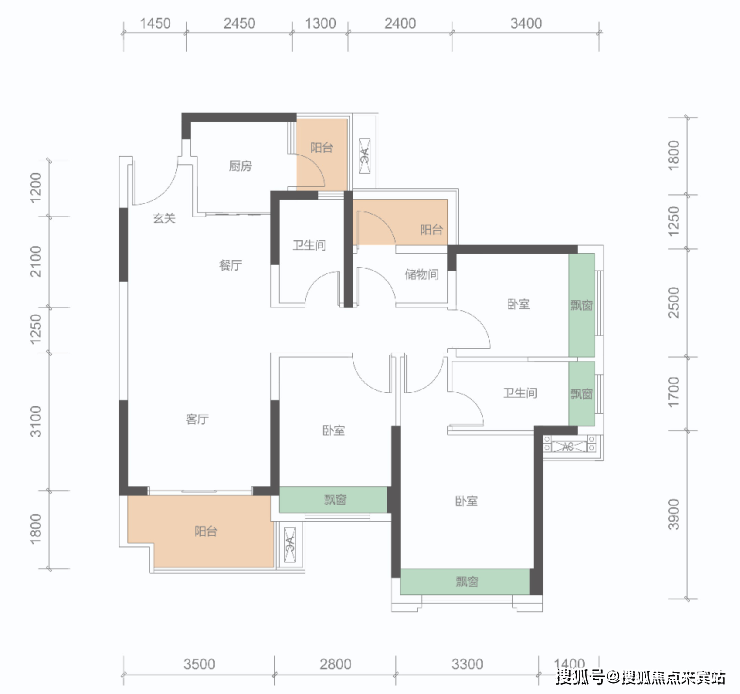 B户型: 100㎡(3+1房,2卫)同级面积稀缺3+1房、稀缺三开间朝南,总价约108万。