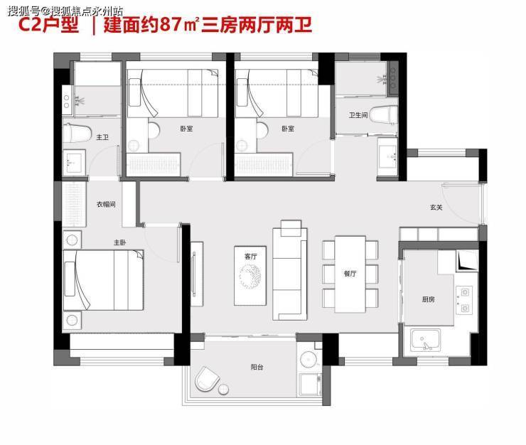 C2户型|建面约87㎡三房两厅两卫:户型方正通透,全南向布局;客餐厅一体化;U型厨房设计;奢阔主卧套房带独立浴室;270度观景阳台,全屋飘窗设计。