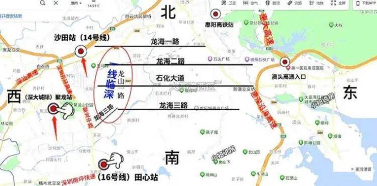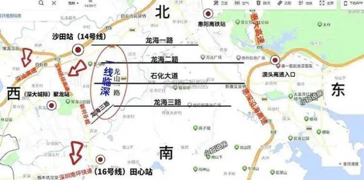 除此之外,这里还靠近深圳坪山的高新产业园区,门口就是大亚湾最早的一条主干道石化大道,走路100米即可到深圳地界,石化大道无缝连接锦绣路