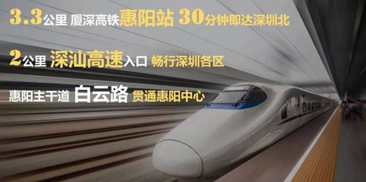 无缝接驳城市主干白云路,直连深圳坪山大道。毗邻深汕高速入口,经高速畅达深圳各区。厦深高铁一站深圳,两站香港;未来在建深汕高铁半小时直通深圳西丽;实现半小时深惠生活圈、一小时深港惠生活圈。