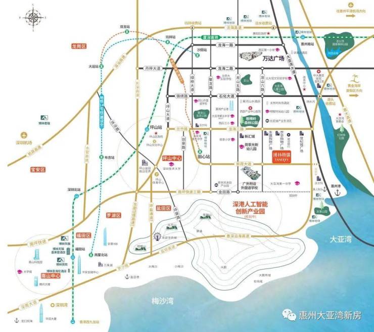 交通配套:项目距离大亚湾主干道龙海三路约300米,龙海三路往西5公里就是深圳坪山地界,项目自驾上深圳南坪快速约7公里,深圳外环高速约7公里。