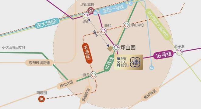 交通配套:14/16号地铁线“坪山围站“F出口距离约370米,3站可到坪山高铁站,快速通往深圳北站,福田中心区,香港西九龙等,周边还有坪山大道,深汕路等主干道。