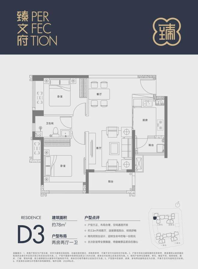 78㎡的2房2厅1卫,设计的是竖厅格局,进门入户玄关,客厅3.4米开间,三开间朝南,L型厨房还带1个小生活阳台,卫生间干湿分离,得房率约85%(包含赠送),阳台朝东南向。