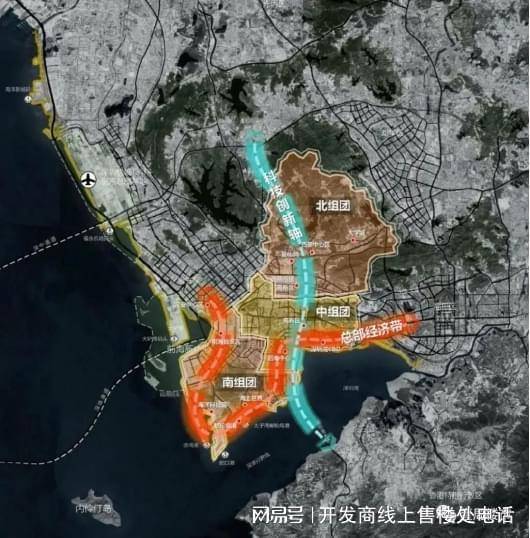 一轴一带三组团:“一轴”即科技创新轴,“一带”即湾区总部经济带,“三组团”为北部、中部和南部三大组团。