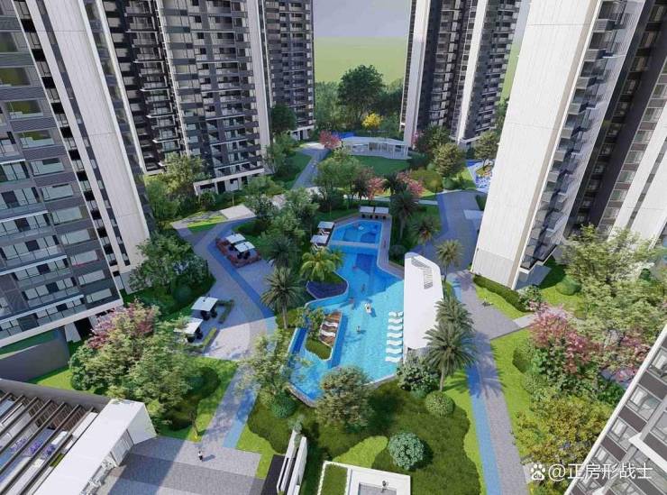 项目外立面采用铝板与玻璃幕墙交织的现代语汇,流畅的横向线条如层叠的山峦轮廓,在光影变幻中勾勒出灵动韵律。建筑群以99-149米错落高度精心排布,既保证每户的观景视野,又形成起伏有致的天际线。园林设计更见匠心——约5.4万㎡示范园林以"一环五组团"布局,240米超尺度围合式景观带中,水幕会客厅与镜面水景相映成趣,约500㎡景观泳池如碧玉镶嵌,15大全龄活动空间巧妙融入绿意环抱。