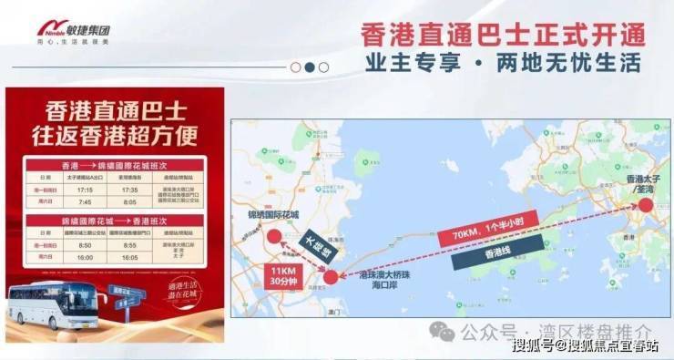社區內有公交總站,接駁珠海;項目距港珠澳大橋直線距離僅約10公里;距廣珠輕軌明珠站約9公里;家門口的快線——坦洲快線第一段工程已完工並通車,實現10分鐘達中山市區,;寶珠北路正式動工(林東小學至錦繡國際花城路段;錦繡國際花城多維立體交通,實現無障礙接駁中珠港澳,是大灣區西最核心的發展圈。
