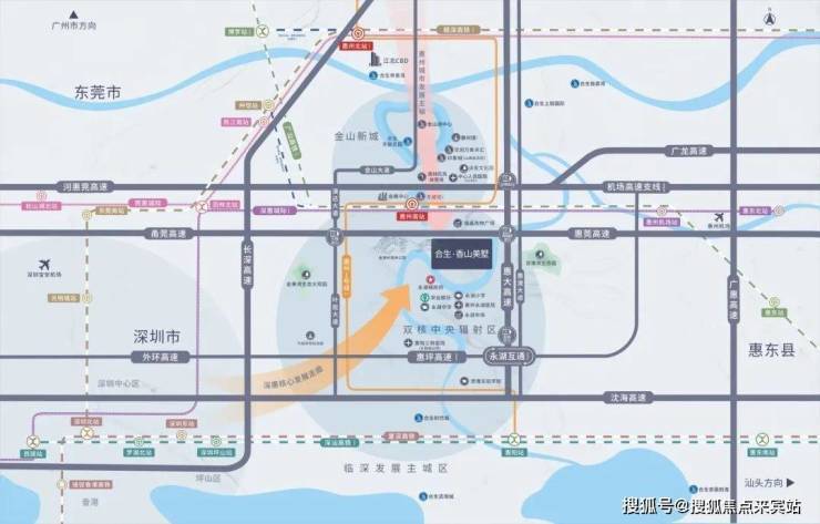 三轨道:即广汕高铁、深惠城轨、惠州地铁1号线,都汇集于惠城南站(已更名为惠州南站),离我们项目约8公里,10分钟车程。