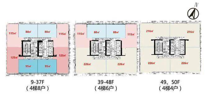 •建筑形态:194米超高层塔楼,共50层,分为低区(9-38层)、高区(39-48层)及顶层(49-50层),梯户比从低区4梯8户到顶层4梯4户逐级优化。