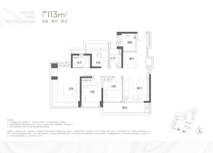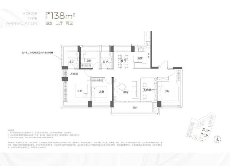 设计的是竖厅双龙抱珠格局,客厅3.5米开间,LDKB一体化,4个卧室分别做到了3.7米/3.4米/2.8米/2.6米的宽度,主卧加2个次卧270°全景飘窗,客厅连接次卧出6.1米长的大阳台,U型厨房,得房率约95-97%(包含赠送),西南或东南朝向。