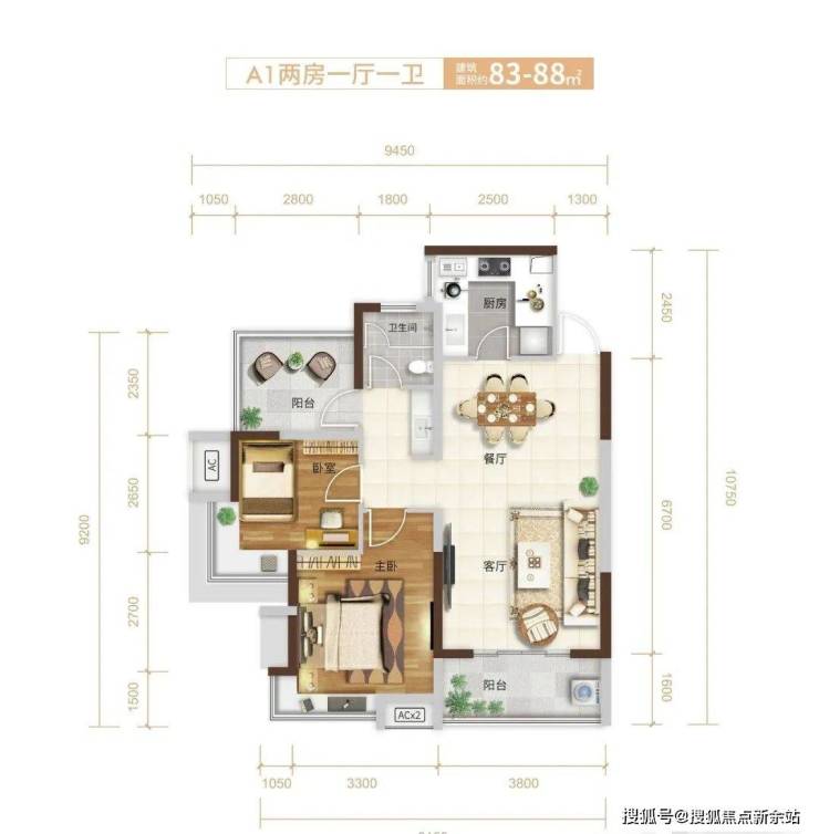 在售户型:A1户型:83-88㎡两房一厅一卫