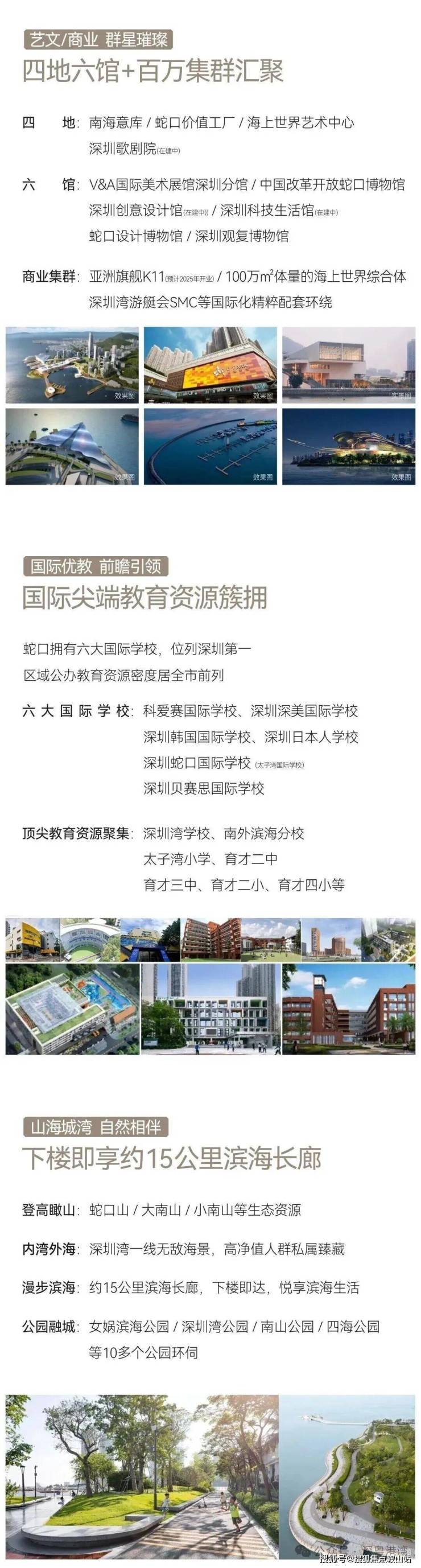 景观环境:项目南、西、北三面环海,拥有 270° 海景视野,周边还有十五公里滨海长廊、蛇口山公园、大小南山公园、四海公园以及深圳湾公园等多个公园环绕。