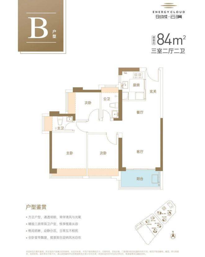 竖厅格局,LDKB一体化设计,客厅3.4米开间,U型厨房,卫生间干湿分离,阳台有正东、西北、东北、东南、西南朝向。