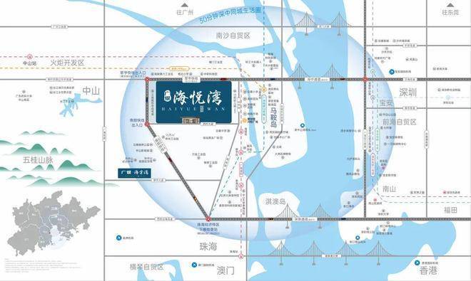 项目雄踞中山翠亨新区国际旅游区与英才培育区交汇处,恰处南沙、前海、横琴三大国家级新区与广深港澳四大城市的“同心圆”圆心,堪称粤港澳大湾区的“地理心脏”。这片热土以“4+2”产业定位(绿色装备制造、智能电子、健康医药、高端都市产业四大支柱,创新金融与文旅健康两大特色)擘画未来,聚揽八方资源。海悦湾总占地22666.7㎡,依山而建,四望皆翠,以得天独厚的地理禀赋,静候价值跃升的黄金时代。