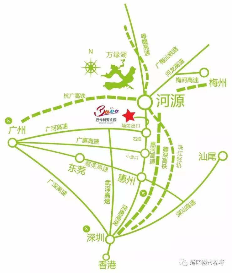 河源巴伐利亚庄园交通配套便利,立体交通,轻松融入深港穗半小时生活圈。广河高速、济广高速、潮莞高速、沿海高速、沈海高速,五大高速与庄园近在咫尺,庄园距埔前高速出口仅500米,全程高速2小时内通达惠州、广州、深圳、香港;赣深高铁、杭广高铁在河源并轨通过,开通后深圳到河源仅需28分钟。