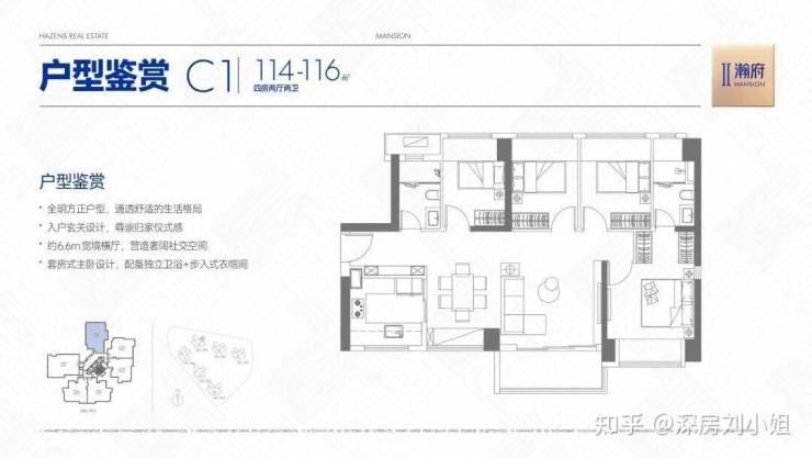 01(C1)户型,横厅朝东南向,客餐厅开间6.6米,LDKB一体化设计,四开间朝南,全屋7面飘窗,主卧套房+步入式衣帽间,3个次卧朝西北向。得房率约78%(不含赠送)。