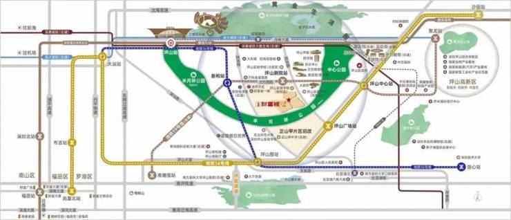 财富城2期所在的区位是整个坪山最核心的地段,汇聚了高铁+14/16号线双地铁+坪山实验学校+坪山中心公园+坪山天虹商场+坪山区政府+坪山体育中心+坪山图书馆,文艺馆等等,所有的市政配套基本都集中在这里,并且财富城2期也是该核心区域内唯一在售的新盘。