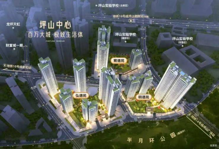 2、财富城2期,买房3件套(地铁+学校+商业)全占了,并且都是坪山区域最顶尖的配套,坪山实验学校+14/16号地铁线/高铁线汇聚+万象城商业/天虹购物中心。