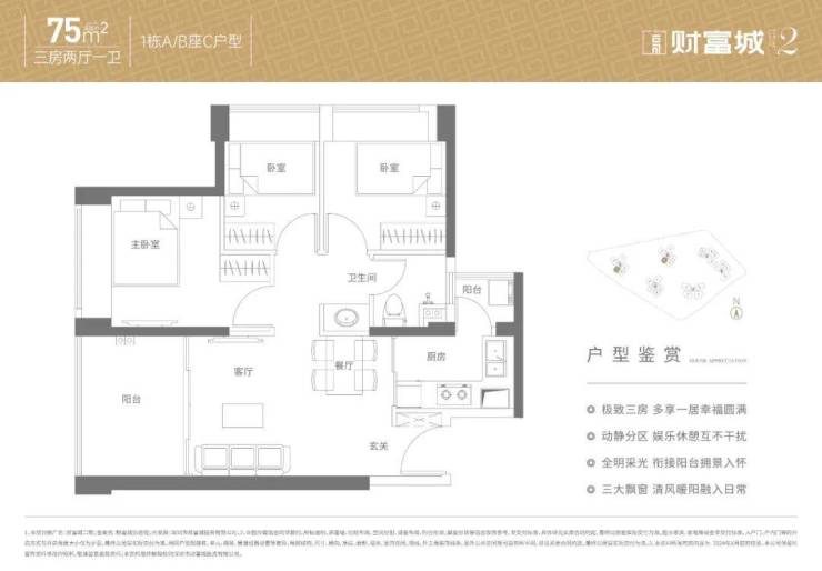 75㎡的3房2厅1卫,设计的是竖厅格局,客厅实测3.043米开间,LDKB一体化设计,3个卧室分别做到了主卧9.61㎡/次卧7.48㎡/次卧6.1㎡(实测面积,去掉墙体),L型厨房约3.84㎡,带1个1.36㎡的小生活阳台,卫生间三段式分离设计,得房率约:74.92%(不含赠送),西南及西北朝向。赠送面积8.61㎡,加上赠送得房率86.46%。