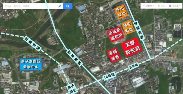 地铁配套:天健和悦府家门口就是16号地铁线“石井站”,1站到燕子湖可换乘后期的深惠城际大鹏支线,5站到坪山围可换乘14号线,10站到龙岗大运,15站到布吉,16站到罗湖,另外还有坪山高铁站,深大城际,可从深惠城际大鹏支线燕子湖站1站直达坪山站换乘。