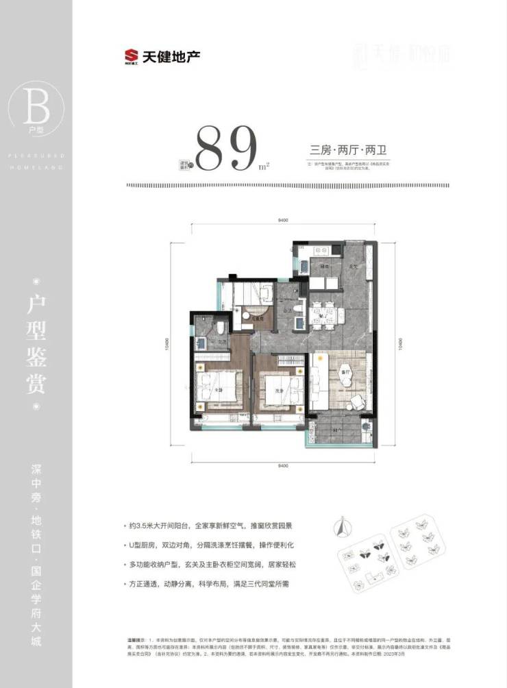 89㎡的3房2厅2卫,设计的是经典竖厅格局,进门入户玄关,客厅3.5米开间,三开间朝南,U型厨房,公卫三段式分离,得房率81.3%(不含赠送),阳台朝西南或东南向。