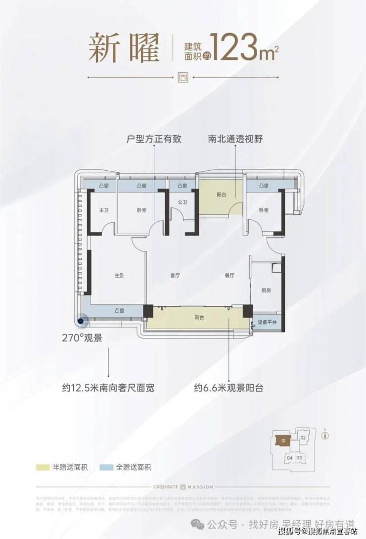 - 布局:横厅南北通透,客餐厅一体化连接5.6米巨幕阳台,全屋6个飘窗面。