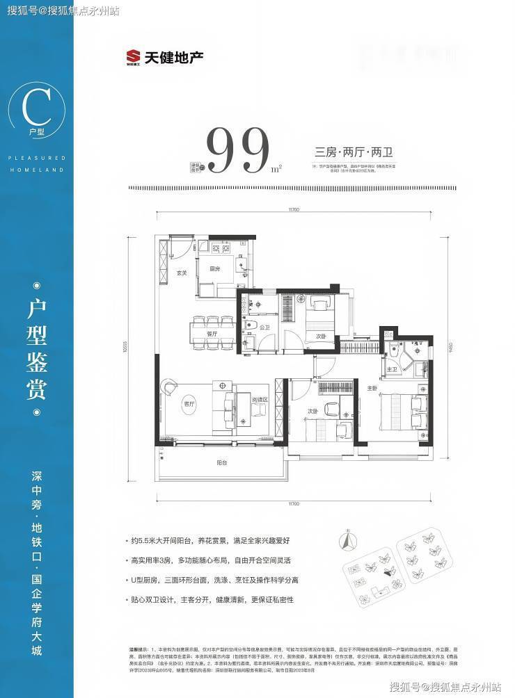 亮点:经典竖厅布局,5.5 米开间客厅连接景观阳台;U 型厨房 + 双卫配置,提升家庭生活效率;主卧套间设计,私密性强。