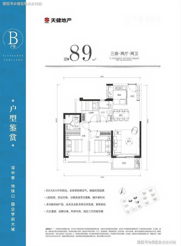 B 户型:3 室 2 厅 2 卫,约 89㎡