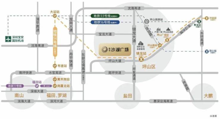 项目距离14号地铁线“锦龙站”约700米,该线路是从坪山沙田开往福田岗夏北的快速线,设计时速120公里,4站到大运,9站到布吉,10站到罗湖,12站到福田岗厦北,用时43分钟。