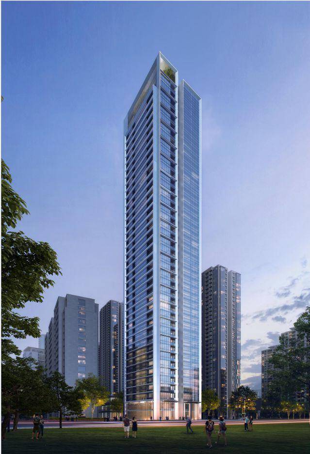 聚焦项目,京基东滨时代为超高层独栋产品,约200米的云端高度搭配大面积玻璃幕墙打造的极简立面,封面之姿尽显