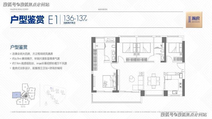 136-137㎡4房2厅2卫07(E1)户型,设计的是横厅朝西南,客餐厅开间6.9米开间,LDKB一体化设计,四开间朝南,全屋7面飘窗,主卧套房+步入式衣帽间,3个次卧朝东北向,客厅连接次卧出7.4米长的超大阳台。