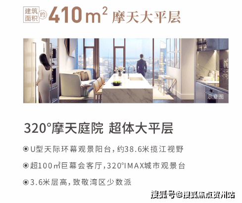 远超现有标准极限的约38.6米U型大阳台,320°摩天庭院、全屋落地窗、约3.6米舒适层高、约120㎡巨幕会客厅等极致的尊崇,刷新城市封面格局。