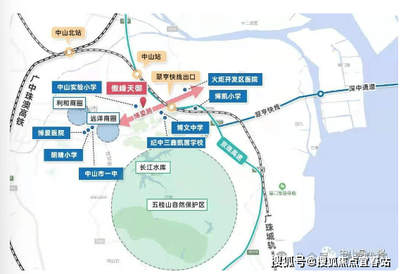 【黄金地段】傲峰·天御地处火炬开发区,紧挨成熟东区,正处于中山主轴博爱路和深中通道延线翠亨快线的黄金交汇点深中融城第一环,媲美深圳深南大道
