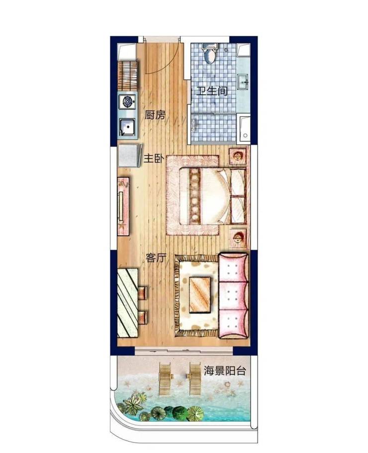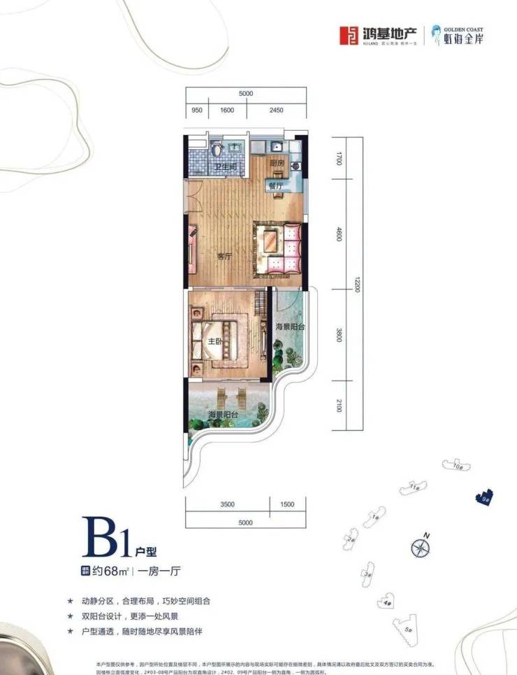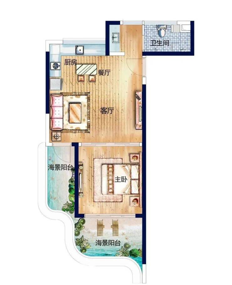 【B1户型】68㎡ 一房一厅休闲度假布局,动静分区,双阳台多个绝佳观海视野。