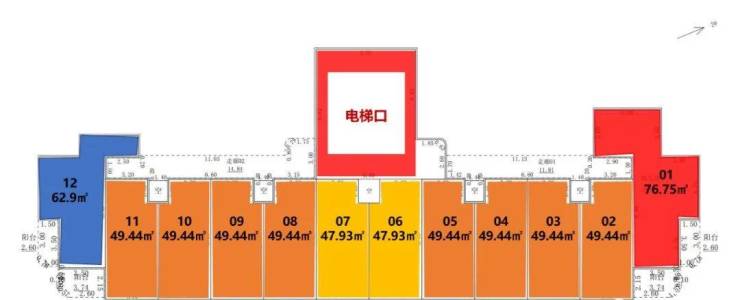 ① 1栋住宅户型:47-49㎡单房、63㎡一房一厅、77㎡两房一厅