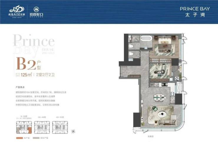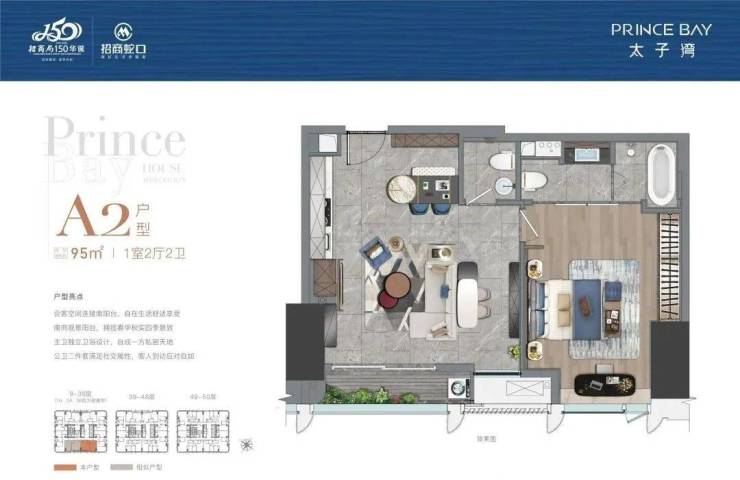 太子湾片区规划总建筑面积约170万㎡,总占地约69万㎡,汇集办公、居住、商业、艺术中心、酒店等多元业态。以“一湾三坊城中城”概念打造布局,在独一无二的太子湾滨海区,汲取山、海、城三大元素,构建高端“居住坊”、“商业坊”、“港务坊”。凭借独树一帜的规划与强大的枢纽功能,成就高端元素集萃纷呈的“城中之城