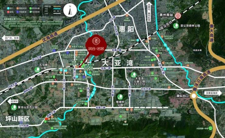 高速出行:多维交通网覆盖深汕高速、惠深沿海高速、惠大高速、南坪快速,外环高速,五高速贯通全城,实现湾区一小时生活;